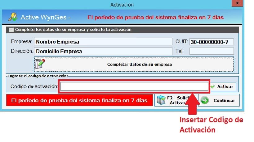Luego de configurar los datos de la empresa, deberás ingresar un código de activación. Este código tiene una duración de 30 días, y deberá ser renovado luego de cada pago de cuota del sistema. Al terminar de pagar la totalidad del mismo, se te suministrará un código final para dejar activo el sistema de forma permanente.