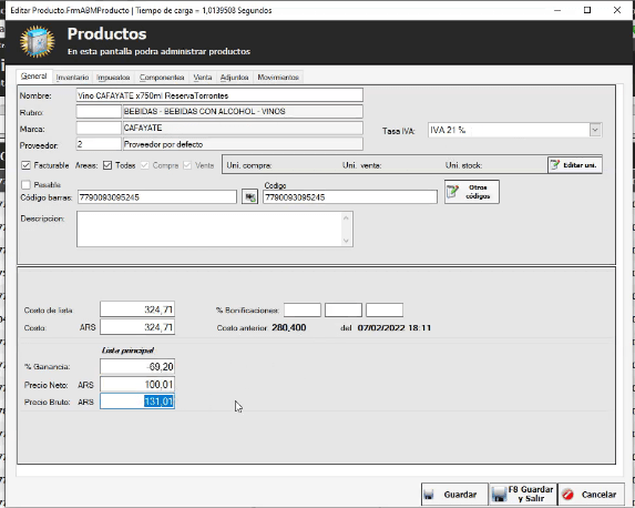 - Probamos que esté todo bien: Editamos cualquier producto, le añadimos un impuesto interno y vemos el cambio en el precio bruto