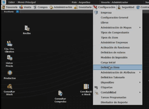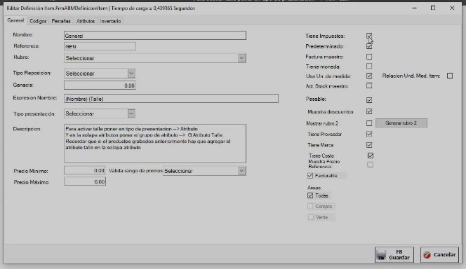 - Activamos la pestaña: Desde Configuración -> Definición Ítem editamos y tildamos Tiene Impuestos