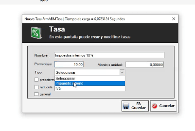 En Nombre le ponemos Impuestos internos y el porcentaje, en este caso 10%; en Porcentaje el porcentaje del impuesto y en Tipo seleccionamos Impuesto interno. Le damos a Guardar