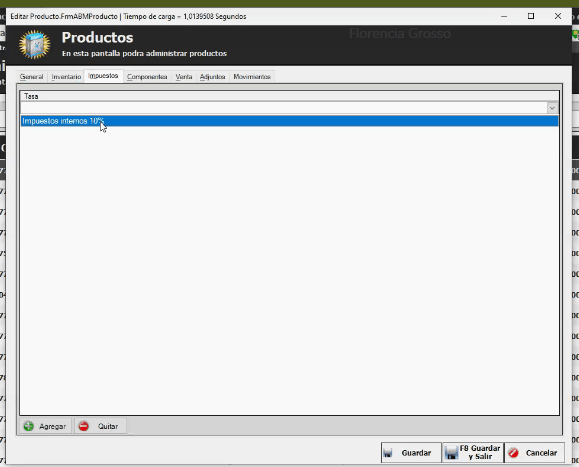Debería aparecer la pestaña Impuestos, en la misma le damos a Agregar y seleccionamos el impuesto que hayamos creado