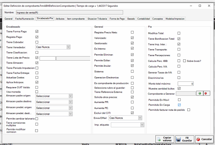 Luego vamos al editor de tipos de comprobantes y modificamos los que el cliente desea hacer la carga, como por ejemplo los Ingresos de Venta, y en la solapa Encabezado/Pie tildamos la opción Permitido en Carga. Le damos a Guardar y listo