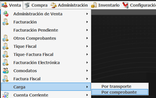 Podemos corroborarlo al reiniciar logueándonos con el usuario del cliente en Venta -> Carga, tienen que estar las opciones Por transporte y Por comprobante