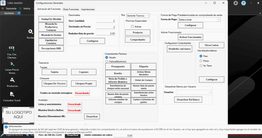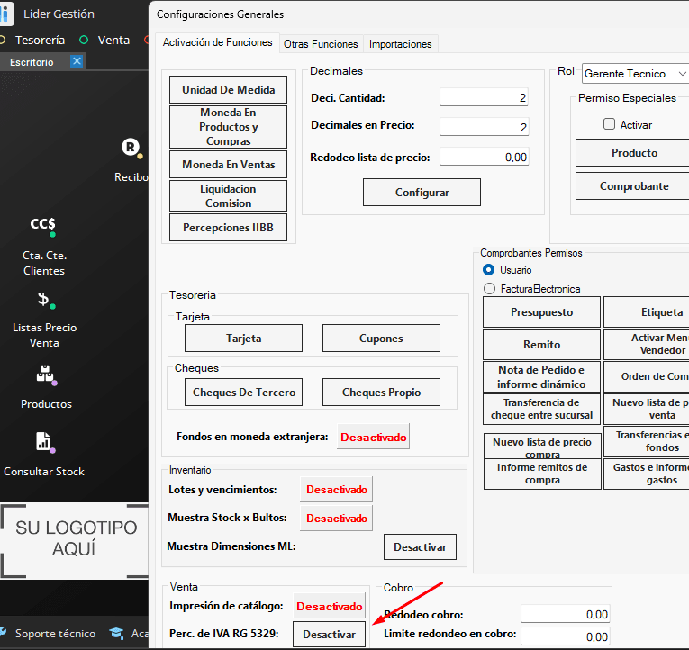 1- Nos dirigimos a Configuración > Activación de Funciones y activamos la función «Perc. de IVA RG 5329», Si nos posicionamos sobre el botón nos da una breve descripción de la función que se activa y el próximo paso a realizar.