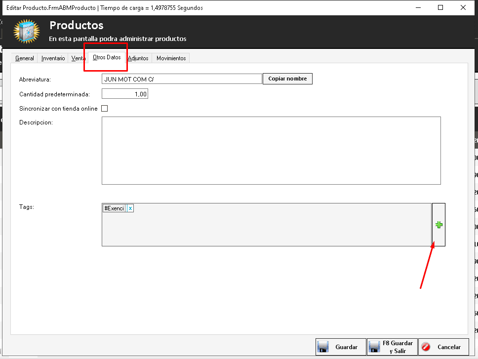 Para crear le Tag vamos a Inventario > Productos, Seleccionamos un producto que sea exento de este impuesto vamos a la pestaña «Otros Datos» y presionamos en el signo +