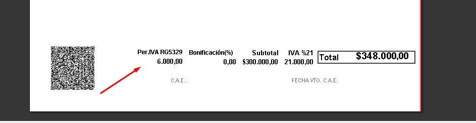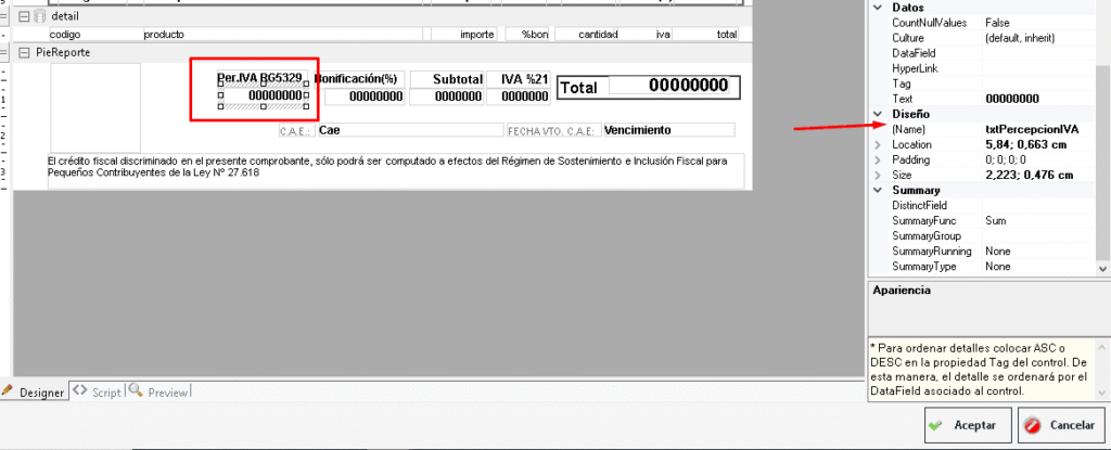 2- Agregar en el modelo de impresión al pies de la factura (donde están los totales) del campo de «Perc IVA RG5329» que corresponde al campo txtPercepcionIVA. Esto hay que hacerlo en Facturas Electrónica A, Nota de Crédito A y Nota de Débito A.