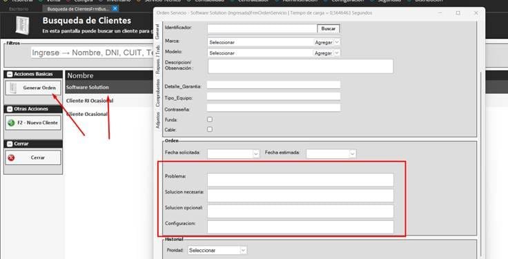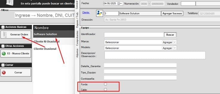 Seleccionamos al cliente → Generar Orden y podemos verificar que los accesorios han sido agregados a la pantalla de orden de servicio.