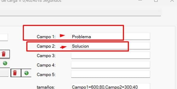Nota: en este caso Campo1=Problema y Campo2=Solución. 600;80 es el tamaño o longitud 300;40 es el tamaño o longitud con una coma ( , ) separa la cantidad de los campos