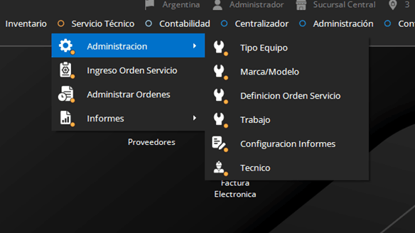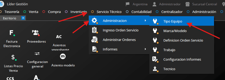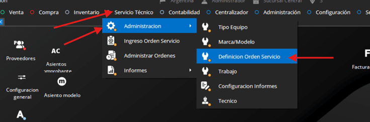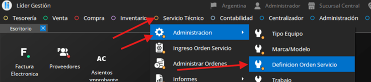 Nos dirigimos al apartado de Servicio técnico → administración → Definición Orden Servicio