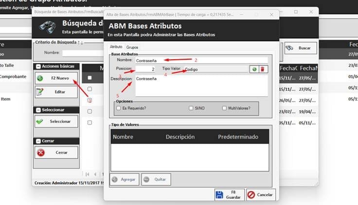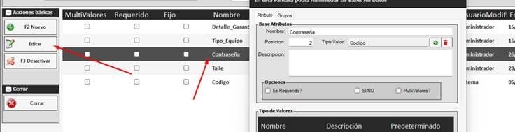Al darle agregar nos carga la siguiente venta donde agregamos un nuevo atributo dándole en F2 Nuevo y agregamos el Nombre, la posición, tipo de valor, y la descripción.