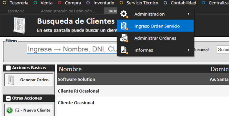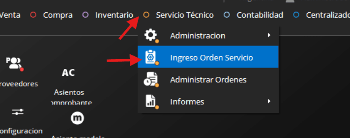 Nos dirigimos nuevamente a Servicio Técnico → Ingreso Orden Servicio