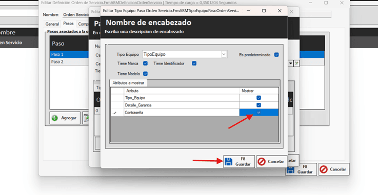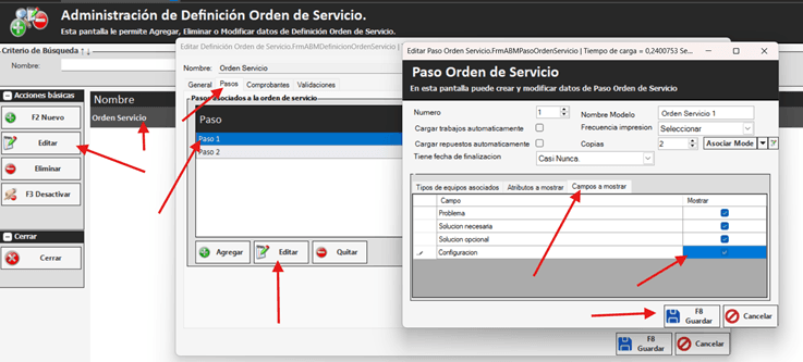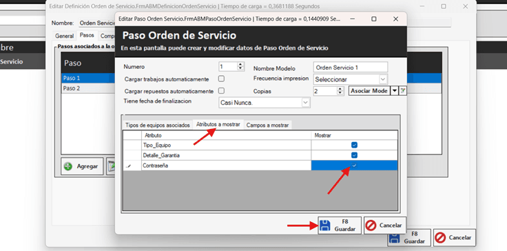 Luego seleccionamos de vuelta la Orden Servicio → Editar → Pasos → Seleccionamos el Paso que estamos editando → Campos a mostrar → Seleccionamos el campo o los campos creados y tildamos en mostrar. Luego guardamos y cerramos.