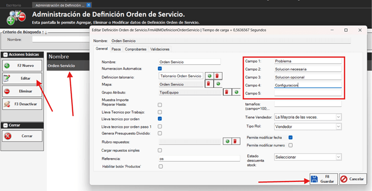 Seleccionamos la Orden Servicio → Editar y agregamos los campos en la parte derecha, presionamos Guardar.