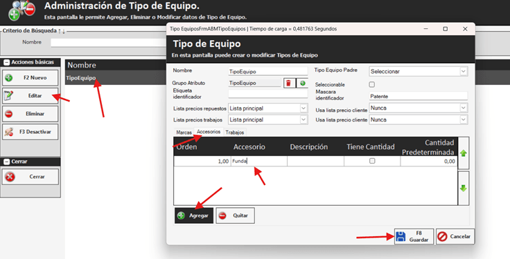 Seleccionamos TipoEquipo → Editar → nos dirigimos a Accesorio → Agregar → añadimos el nombre del accesorio. Por ultimo guardamos.