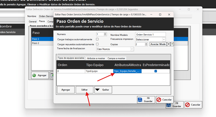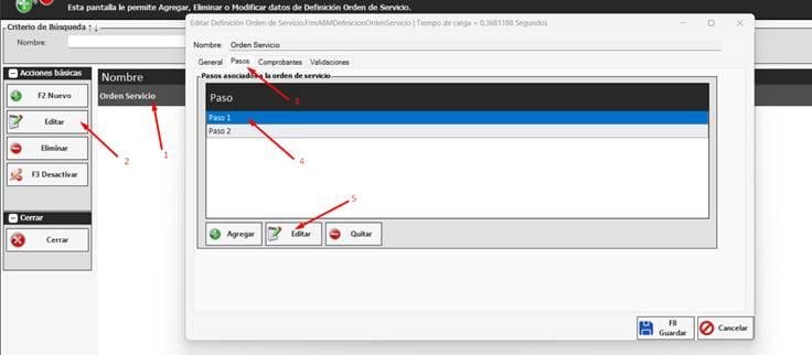 Una vez allí seleccionamos El ítem Orden Servicio → Editar → Pasos → Seleccionamos el paso → Editar.