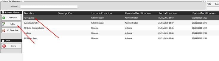 Una vez entremos nos posicionamos sobre TIpoEquipo → Editar