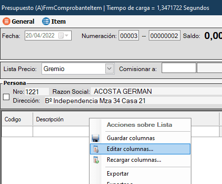 Para añadir la columna de códigos de barras vamos a crear o editar un presupuesto y en la cabecera de la grilla hacemos click derecho, seleccionamos Editar columnas…