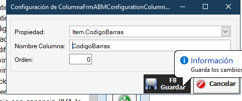 En Propiedad le ponemos Item.CodigoBarras, en Nombre Columna CodigoBarras y le damos a Guardar y Guardar nuevamente
