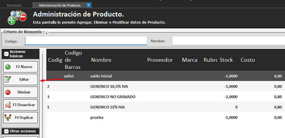 - Deberá dirigirse a Inventario – Administración de Inventario – Inventario. Luego, selecciona un producto y presiona en el botón editar.