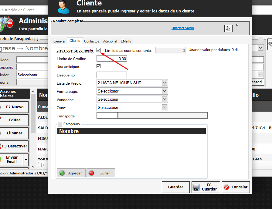 Si no aparece Cuenta Corriente como forma de pago todavía debemos revisar que los clientes tengan tildada la opción Lleva cuenta corriente