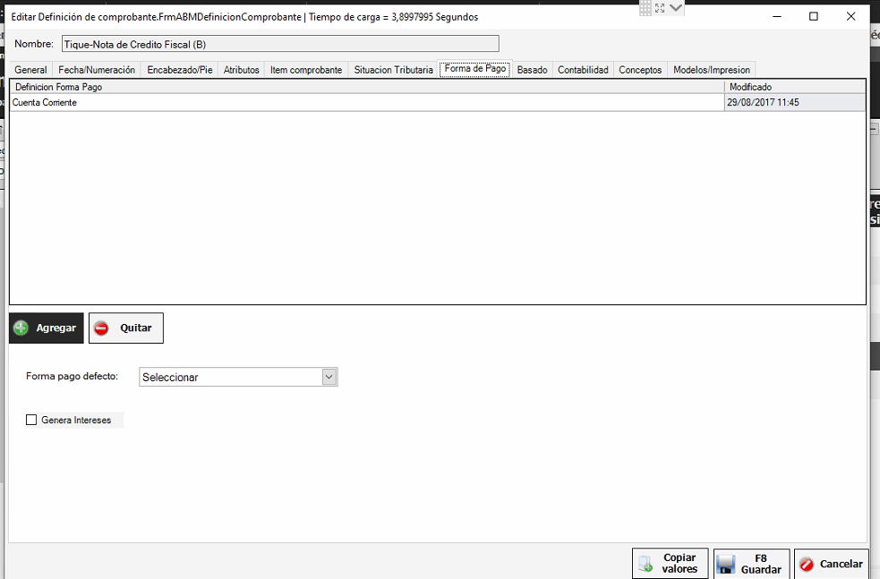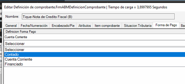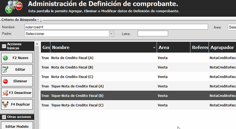 - Configuración – Tipos de Comprobante – Buscamos el comprobante, en este caso Tique-Nota de Credito Fiscal (B)