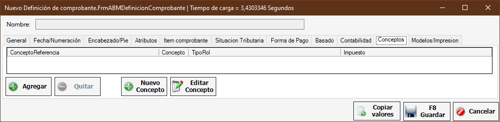 Para esto vamos a Configuración -> Tipos de comprobante, seleccionamos uno cualquiera y le damos a Editar. En la pestaña Conceptos le damos a Nuevo Concepto