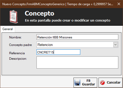 Una vez ahí le asignamos el nombre y su jurisdicción en el campo nombre, en Concepto Padre seleccionamos Retención y en Referencia un nombre único añadiéndole un número al final. Le damos a Guardar, luego a Cancelar y Listo