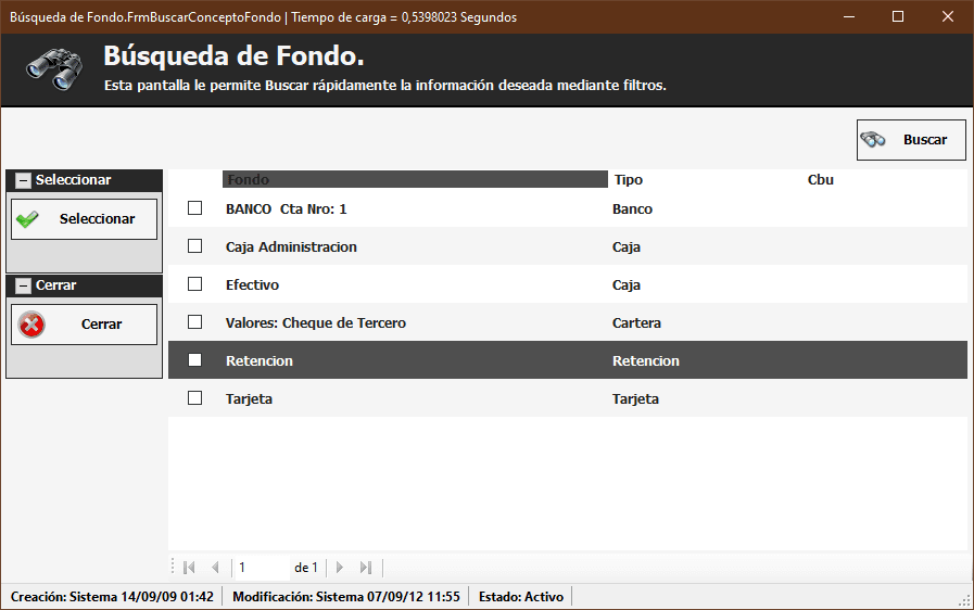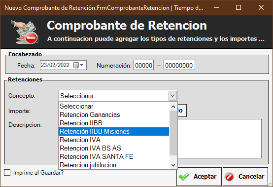 Se nos abrirá una ventana en la que en concepto buscamos la retención que creamos, si todo está bien aparecerá en la lista