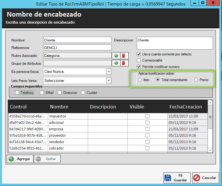 Una vez dentro del menú de edición de rol, buscamos la opción llamada “Aplicar bonificación sobre: “y elegimos la opción “Total Comprobante”.