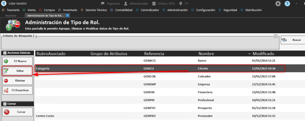 Buscamos el tipo de rol “Cliente” y usamos el botón “Editar” (Se puede ordenar la lista por nombre para su mejor búsqueda).