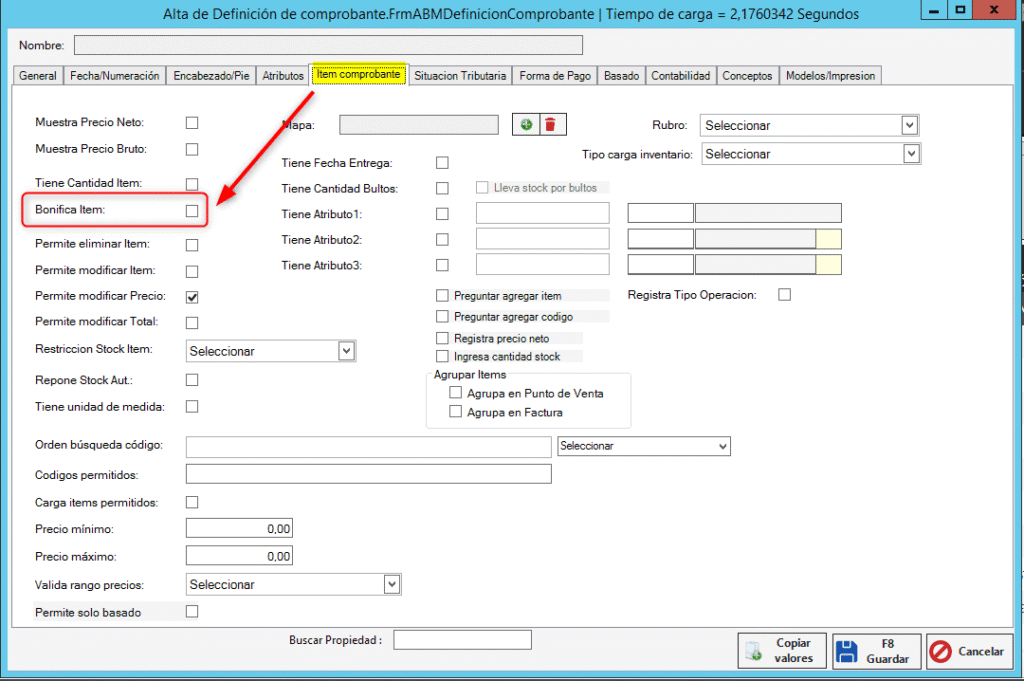 - Entramos en la solapa “Item comprobante” y elegimos la cuarta opción llamada “Bonifica item”.