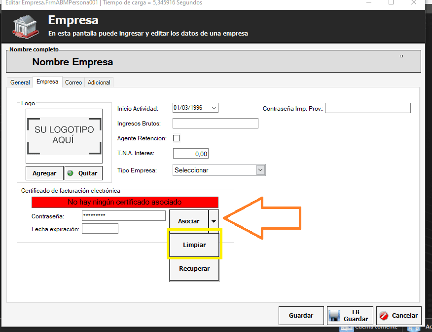 - Asociamos el nuevo certificado al cliente. Desde Configuración – – – Empresa