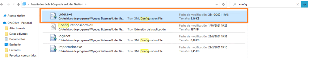 Dentro de la carpeta Lider Gestón buscamos el archico Lider.exe.config