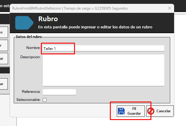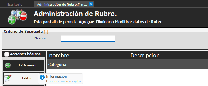 Configuración – Definición de rubro. Luego, presionamos en F2 NUEVO