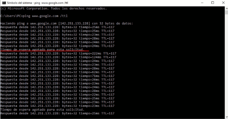 Para chequear la estabilidad de se puede hacer haciendo un ping a los servidores de Google ingresamos al CMD de Windows y hacemos un ping: ping www.google.com /ttl