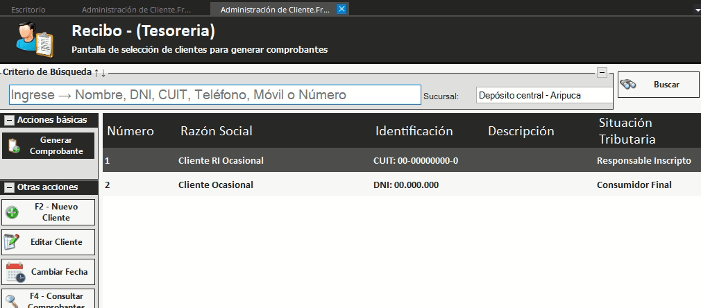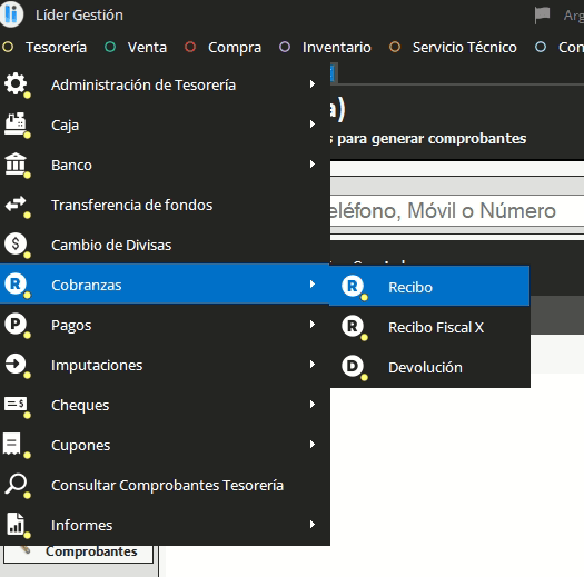 Luego, dirígete a: tesorería – cobranzas – recibo, selecciona el cliente y haz clic en “generar comprobante”.