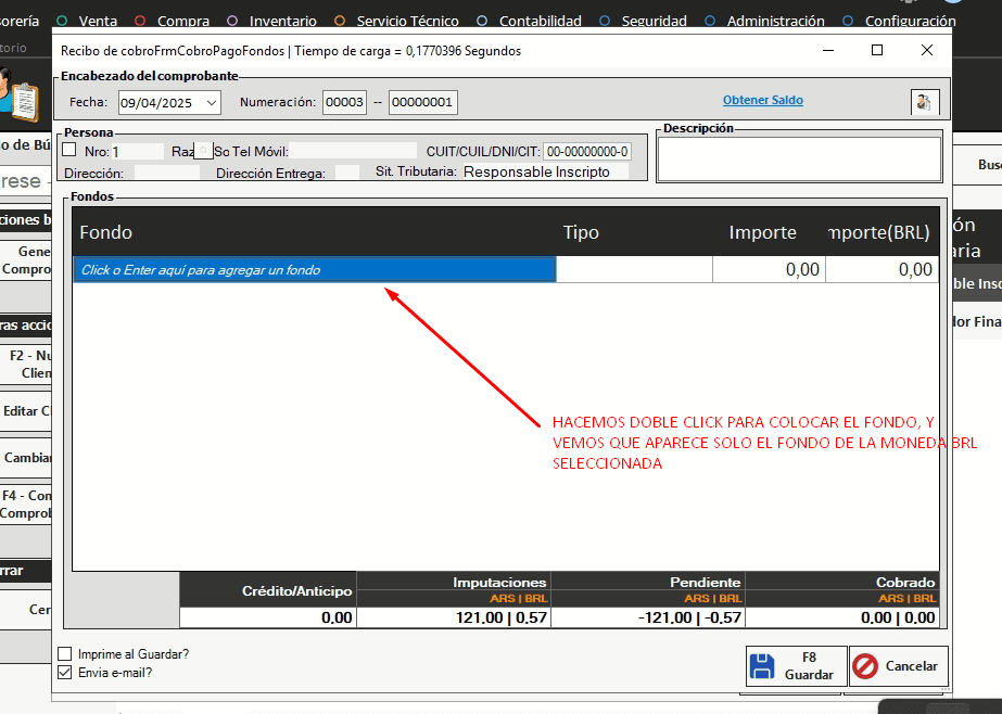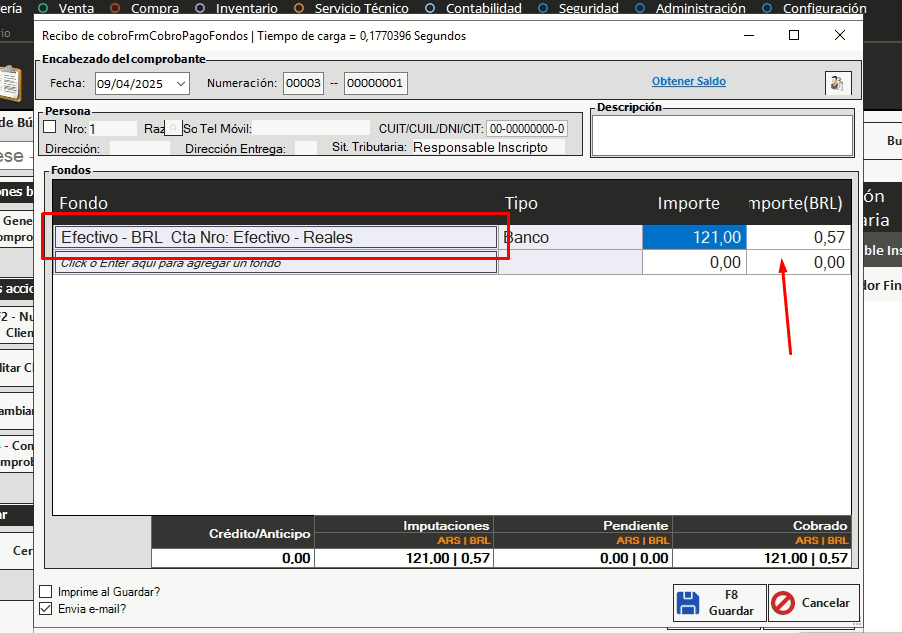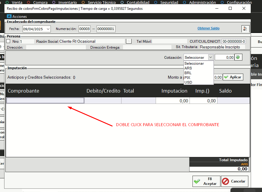Observa que puedes modificar la moneda; simplemente selecciona el comprobante haciendo doble clic y cambia la moneda a BRL.