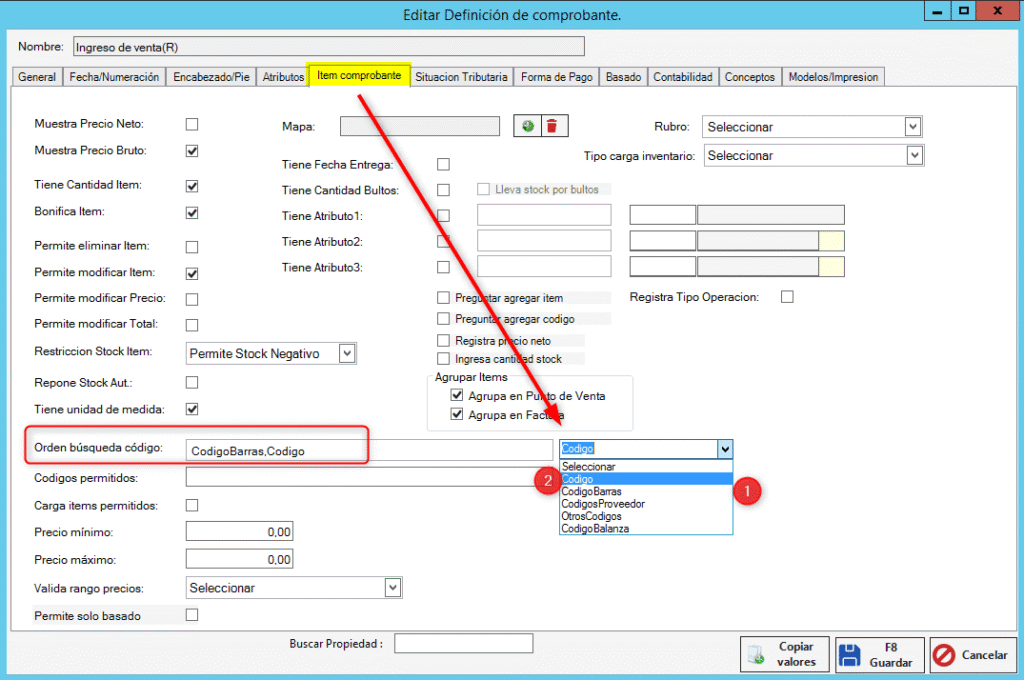 - Nos dirigimos a la solapa “Item comprobante” y luego hasta la opción “Orden de búsqueda código”, seleccionamos la opción “Código de barras” y luego “Código”, en el campo “Orden de búsqueda código” debería quedar algo como: “CodigoBarras, Código”.