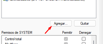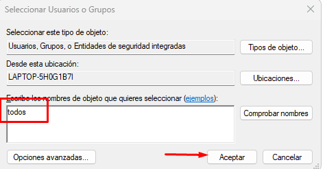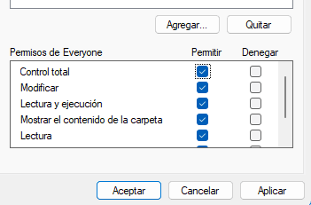 Y escribimos TODOS o EVERYONE y guardamos. Seleccionamos control total y aplicamos y guardamos.