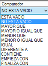 - Comparadores de tipo campo “vacío/no vacío”, útil cuando queremos detectar información incompleta;