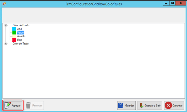 Utilizando los botones de “Agregar”, “Remover”, “Guardar”, “Guardar y Salir” y “Cancelar”, podemos trabajar en la pantalla antes mencionada.