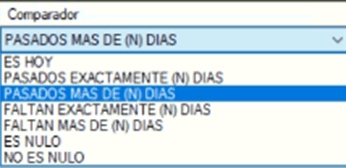 • “pasados más de (N) días”, que sirve para marcar todo registro que cumpla igualando o superando el límite de días establecido en la columna “valor”;
