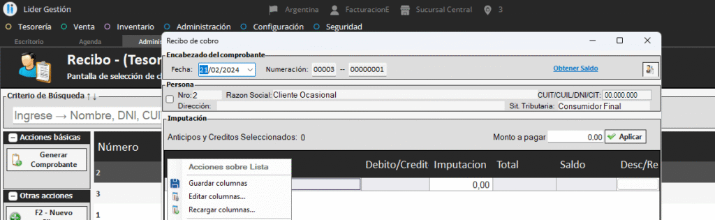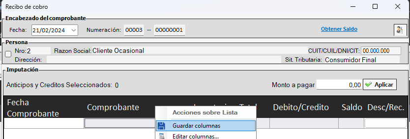 Para agregar la columna fecha del comprobante que está basando en el recibo, deberá realizar click botón derecho en la grilla y presionamos «editar columnas»