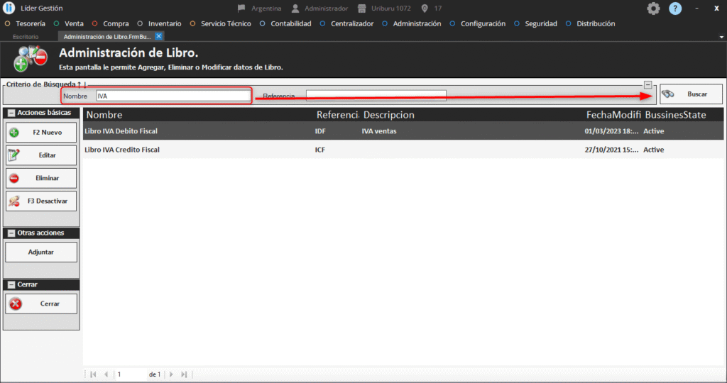 Desde «CONFIGURACION → LIBROS» en nombre escribir «IVA» y seleccionamos –BUSCAR –