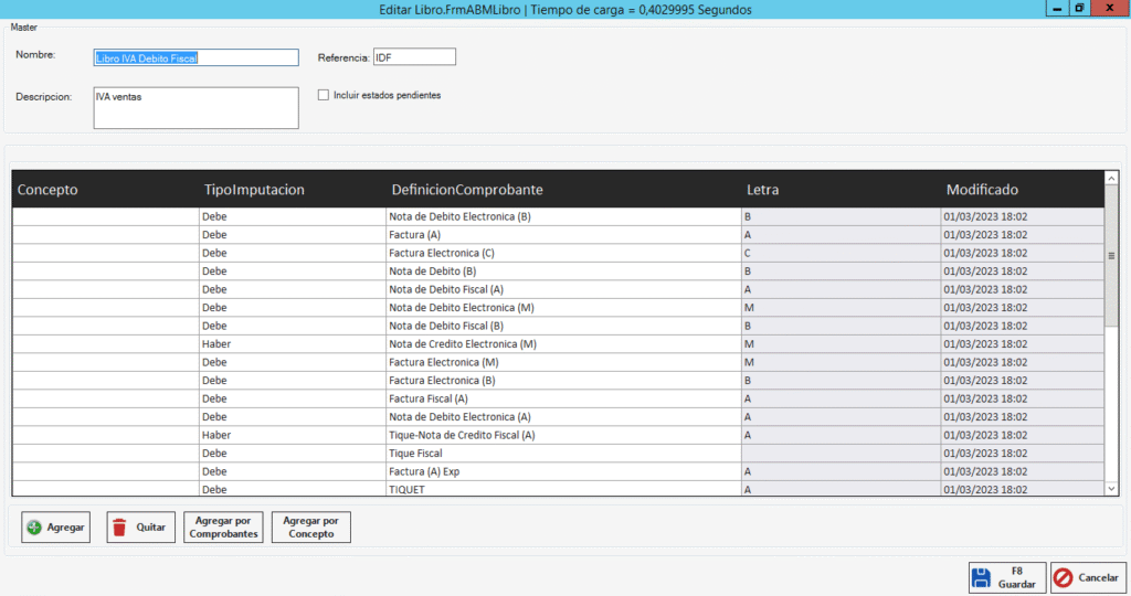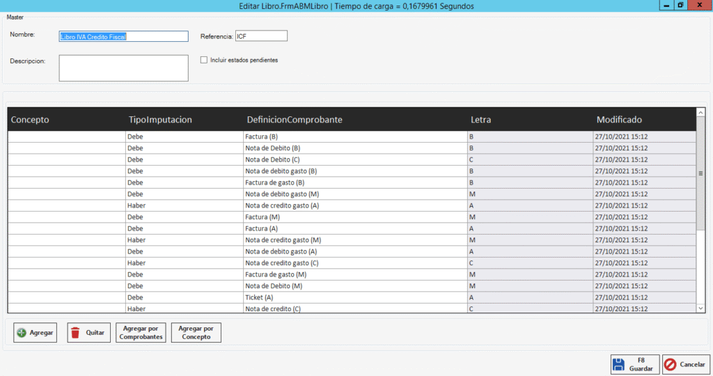 En tipo de imputación elijo DEBE o HABER (según corresponda). En Definición de comprobantes Elijo el comprobante a agregar. Luego de cargar estos datos, usamos «F8 Guardar»