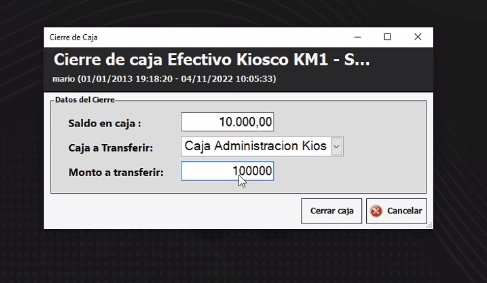 En la siguiente pantalla se debe colocar el saldo que tenemos en la caja, la caja a la cual vamos a transferir el monto y por último, el monto que queremos transferir a la caja de administración correspondiente. Le damos a Cerrar caja y listo.