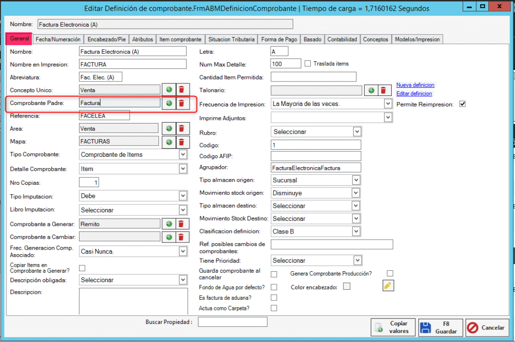 Una vez en la ventana debemos revisar en la solapa “General” en la opción que dice “Comprobante padre” podremos ver cual es el comprobante padre.