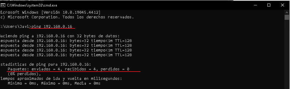 Vamos a la consola de CMD y hacemos un ping a la IP del servidor