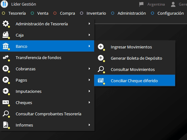 Para realizar la conciliación de cheques diferidos o propios, debemos ingresar al menú Tesorería – Banco – Conciliar Cheque diferido.
