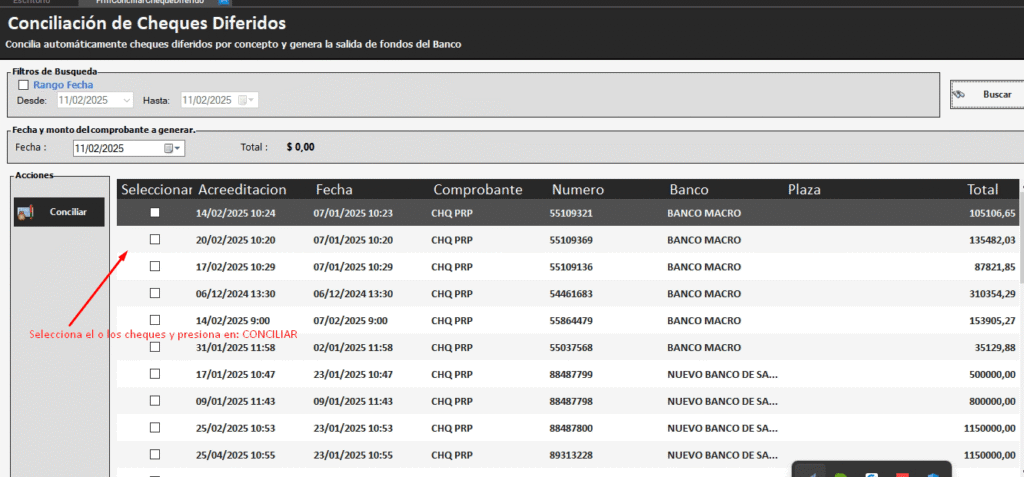 Una vez dentro, lo que debemos hacer es seleccionar los cheques deseados y luego presionar el botón Conciliar, de esta forma, se nos abrirá una ventana en la cual veremos todos los cheques seleccionados junto al monto total y la cuenta.